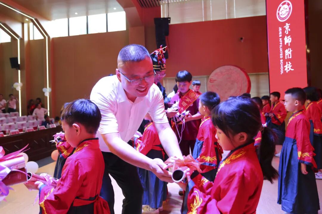 京师时代教科院院长、京师附校总校长陈二泉致辞。铸牢中华民族共同体意识,只有树立中华优秀传统文化自信,才能把人民的期盼、民族的向往、国家的追求三者融为一体。启智礼,是中华文明的传统文化,作为人生四大礼之一;启智礼,是孩子们启智开学的标志。我们举行启智礼,为新生启蒙,希望孩子们的心灵增强归属感,爱国、爱校、爱读书,勤勉好学,积极上进,健康成长。陈校长对孩子们提出了几点期望:1.有理想;2.懂感恩;3.怀正气;4.敢担当。陈校长深情道:孩子的成长离不开家长的支持与关爱,希望家校保持密切合作,共同关注孩子的成长,为他们营造一个温馨、和谐的家庭生活环境。